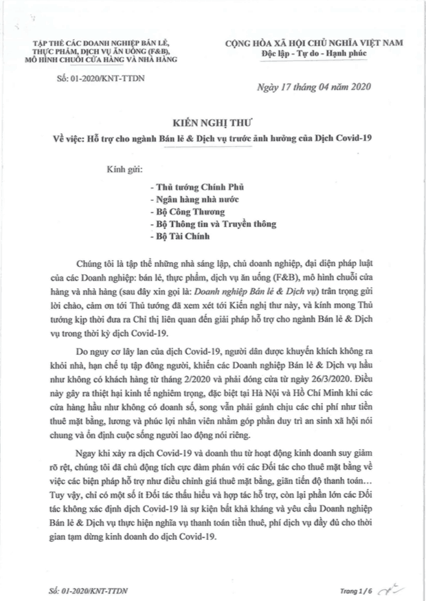 Trong Kiến nghị thư có những đoạn như thế này: Do nguy cơ lây lan của đại dịch Covid-19, người dân được khuyến khích không ra khỏi nhà, hạn chế tụ tập động người, khiến các doanh nghiệp bán lẻ - dịch vụ hầu như không có khách hàng từ tháng 2/2020 và phải đóng cửa từ ngày 26/3/2020.